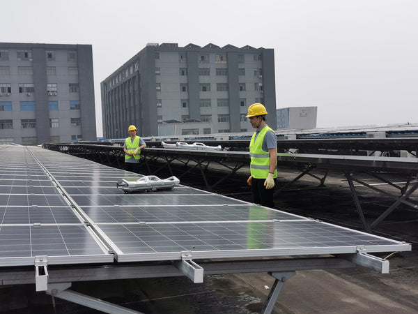 Our cleaning robot is specifically designed for industrial settings with large-scale solar panel setups. It traverses around the panels, using advanced technology to clean them without water, resulting in improved efficiency by 20%.